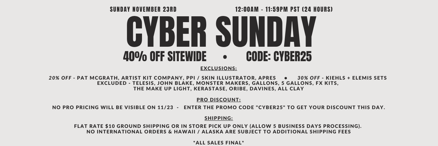 *PRO DISCOUNTS WILL NOT BE VISIBLE ONLINE NOVEMBER 23RD. IN ORDER TO RECEIVE A DISCOUNT PLEASE USE PROMO CODE: CYBER25