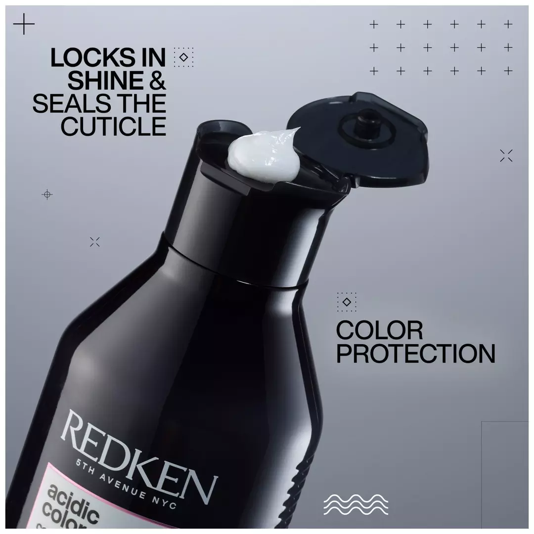 The latest innovation in color care, Redken Acidic Color Gloss Conditioner is a revolutionary glossing conditioner that extends salon-grade color, conditions and provides salon-like shine. This acidic formula is ph-balanced for long-lasting color vibrancy for up to 32 washes* and 76% shinier hair**. It intensely conditions hair and seals the cuticle to lock in molecular-level shine. Use as a complete routine with Acidic Color Gloss Shampoo, Activated Glass Gloss Treatment and Heat Protection Leave-In Treatment.