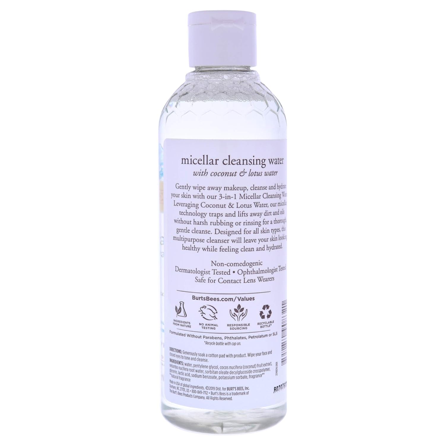 Generously soak a cotton pad with Burt’s Bees product. Wipe your face and closed eyes to remove dirt and makeup—no harsh rubbing or rinsing required.