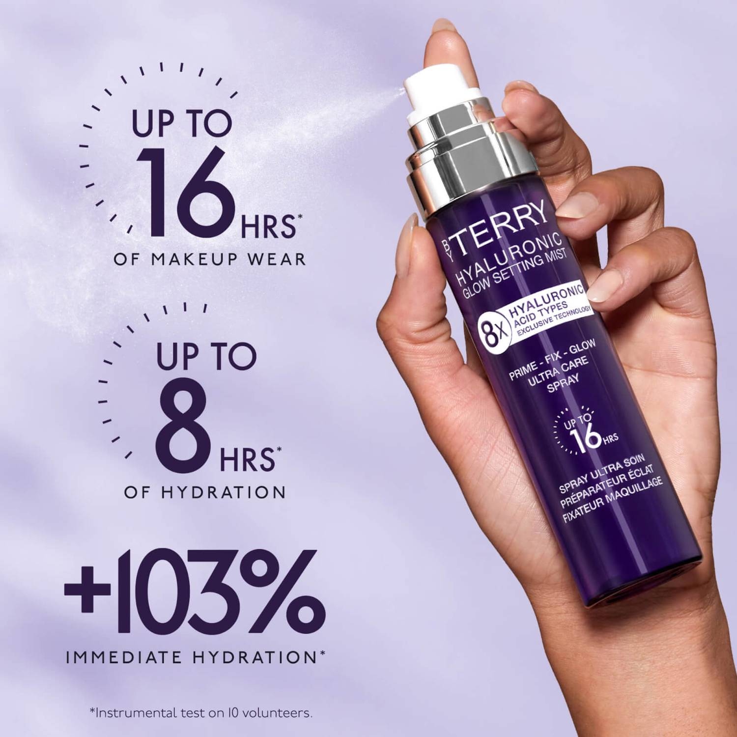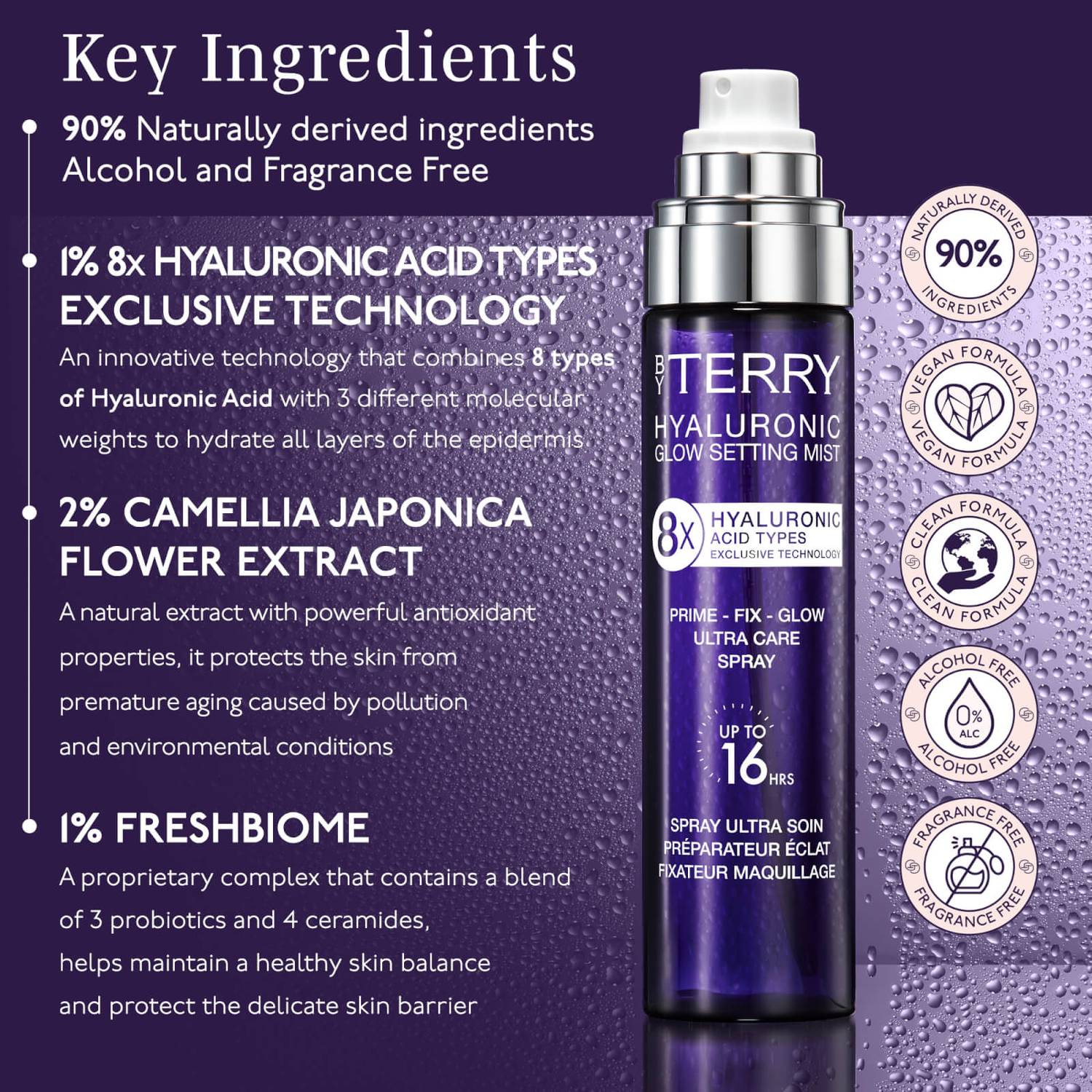 This BY TERRY multi-functional fine mist hydrates the skin up to 8 hours*, primes and sets makeup for up to 16 hours* to be smudge-proof & transfer-resistant. Its skincare infused formula includes our exclusive technology of 8 different Hyaluronic Acids with a unique protective complex of Camellia Japonica Flower Extract, Ceramides and Probiotics that help to protect against external aggressions** for a healthy and flawless skin.