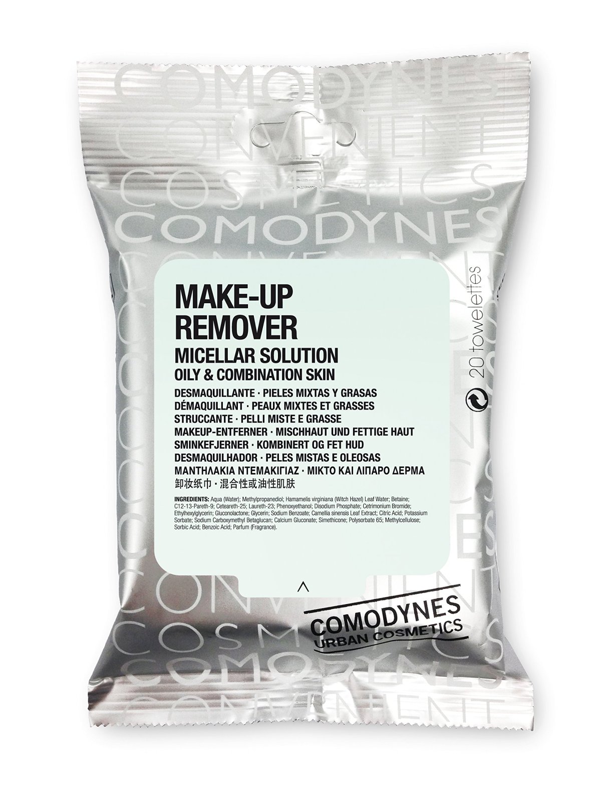 COMODYNES MAKE-UP REMOVER OILY & COMBINATION SKIN are towelettes with a specific formula for oily and combination skin. Just one dosage is the equivalent of cleansing milk, facial toner and eye make-up remover. 3-in-1 effect for complete cleansing in just one step. The extra-soft 100% viscose towelettes are moistened with a micellar solution (micellar water) with a pH of natural tears, excellent skin and eye tolerance, which eliminates dirt particles and traces of make-up leaving your face clean, fresh and feeling good. The texture of the towelettes has been specially chosen (they do not contain resins) and the particular system of fabrication means that the towelettes perfectly incorporate and retain the exclusive formula which allows for perfect make-up removal and gentle exfoliation by scrubbing.