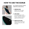 Soften your body with hot water for 5 minutes, then step away from the water. Dampen the scrubber and squeeze out the excess water. Holding the large straps, use a side-to-side motion and apply pressure, pulling the handles away from your body. After exfoliating, apply your favorite body oil or moisturizer to hydrate your skin.