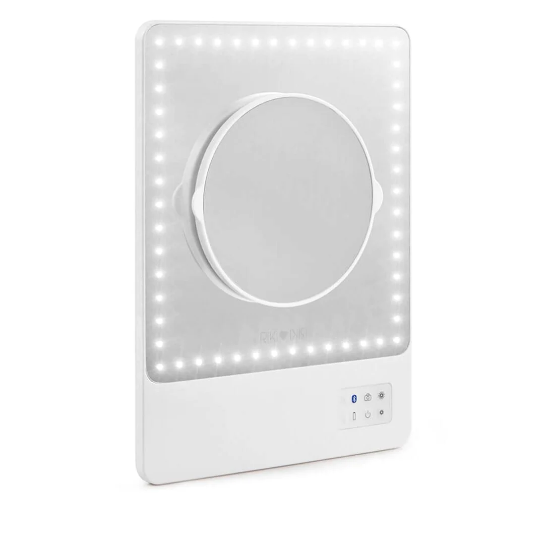 RIKI SKINNY was on Oprah’s favorite things list for a reason. It is the #1 portable LED vanity and streaming device with Bluetooth capabilities and 5 dimming stages. Weighing in at 1.5 pounds and about the size of an iPad, this LED travel makeup mirror combats fluorescent lights and has a 5x or 10x magnifying mirror to ensure perfect makeup application.