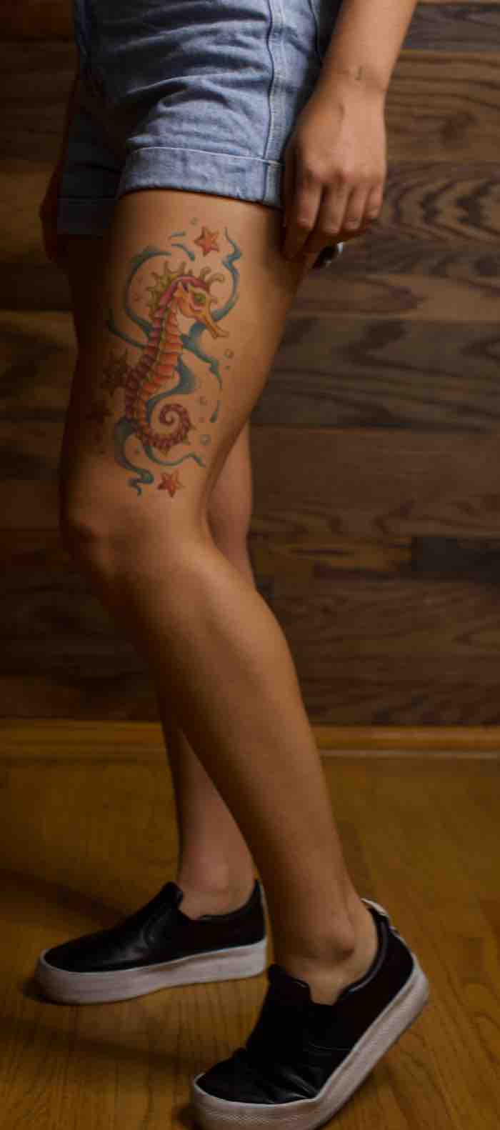 Color waterslide tattoo with reverse image on the back to help with placement.