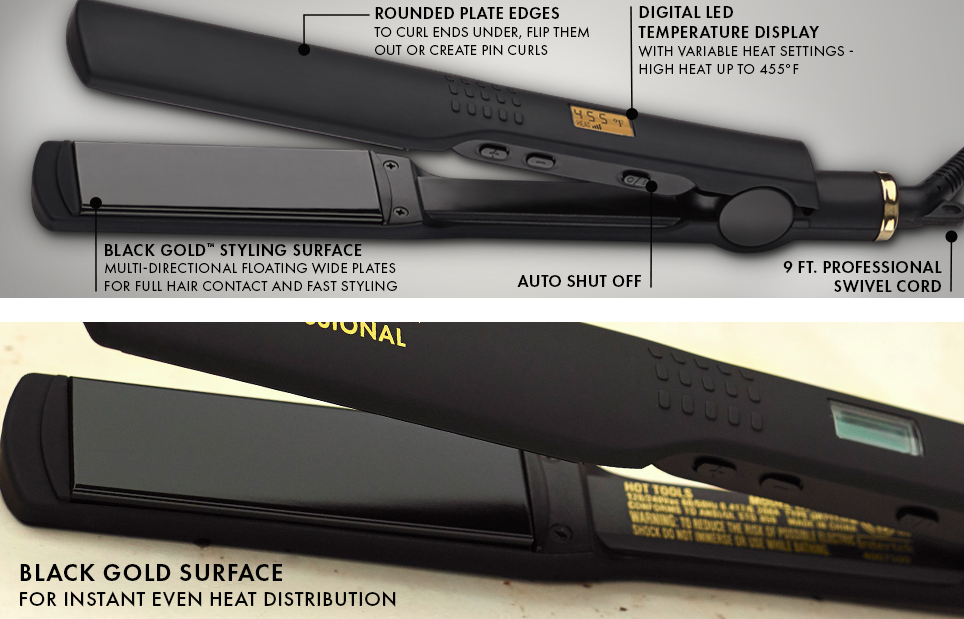 The pro-level Black Gold Digital Flat Iron is equipped with wide multi-directional floating plates and advanced technology for efficient styling and professional results. No matter the hair type or texture, the Black Gold styling surface leaves hair silky smooth.