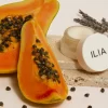 Caprylic/Capric Triglyceride, Mango Butter Dimer Dilinoleyl Esters/Dimer Dilinoleate Copolymer, Capryloyl Glycerin/Sebacic Acid Copolymer, Bis-Diglyceryl Polyacyladipate-2, Polyglyceryl-10 Decaoleate, Polyglyceryl-10 Pentaoleate, Polyglyceryl-10 Pentaisostearate, C10-18 Triglycerides, Butyrospermum Parkii (Shea) Butter, Cera Alba/Beeswax/Cire d’abeille, Glyceryl Stearate SE, Hydroxystearic Acid, Aroma, Cocos Nucifera (Coconut) Oil, Lactobacillus/Papaya Fruit Ferment Extract, Silica, Polyhydroxystearic Acid, Ricinus Communis (Castor) Seed Oil, Carica Papaya (Papaya) Seed Oil, Sodium Hyaluronate, Tocopherol, Hydrogenated Castor Oil, Stevia Rebaudiana Leaf/Stem Extract, Gardenia Taitensis Flower Extract, Salicornia Herbacea Extract, Undaria Pinnatifida Extract, Geraniol, Limonene, Linalool, CI 77891 (Titanium Dioxide)