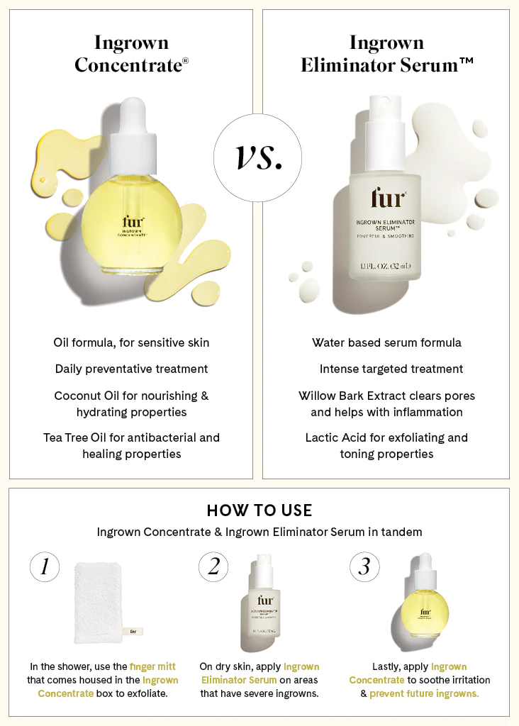 When: We recommend using the finger mitt to exfoliate around 3-5 times a week, and using Ingrown Concentrate as many times as needed—you can either use it to treat spots that have already cropped up, or if you’re a super sensitive skin type and prone to bumps, daily use may be best as a preventative measure.
