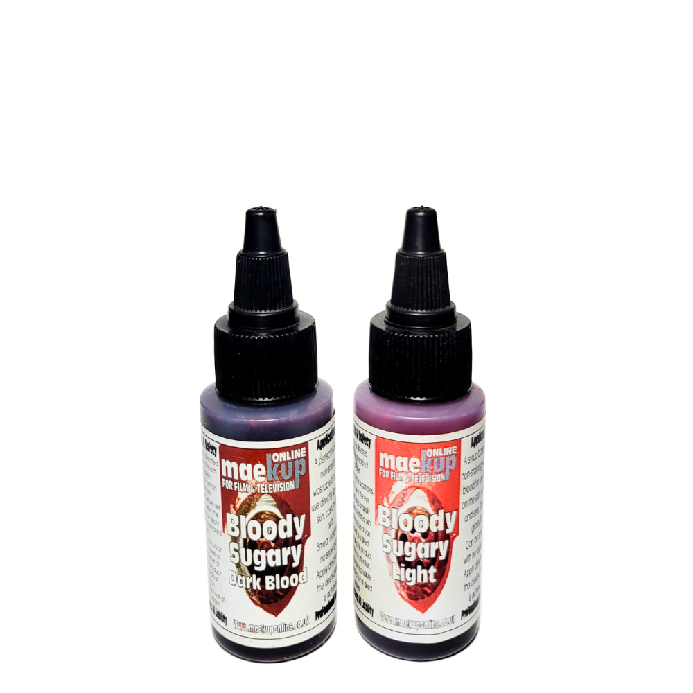 Maekup Bloody Sugary Blood is a perfect realistic non-staining, syrup based, non-beading blood perfect for use on skin, set dressing, or costumes. Dried to a high-gloss candy-esque finish. Can be smeared with no separation. Available in Light & Dark.