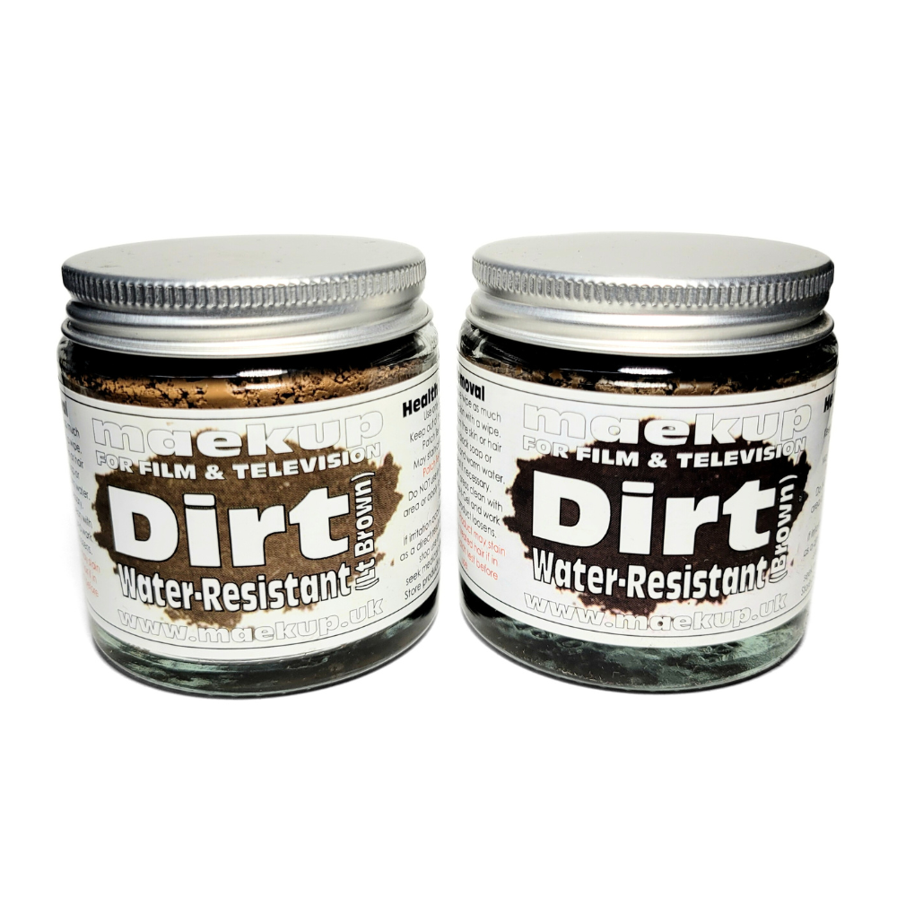 Maekup Water-Resistant Dirt is an oil based product for producing fully waterproof dirt type effects on skin. May stain dyed/color-treated hair, sets, or costumes. Can be smeared or used in clumps dependent upon the required effect.