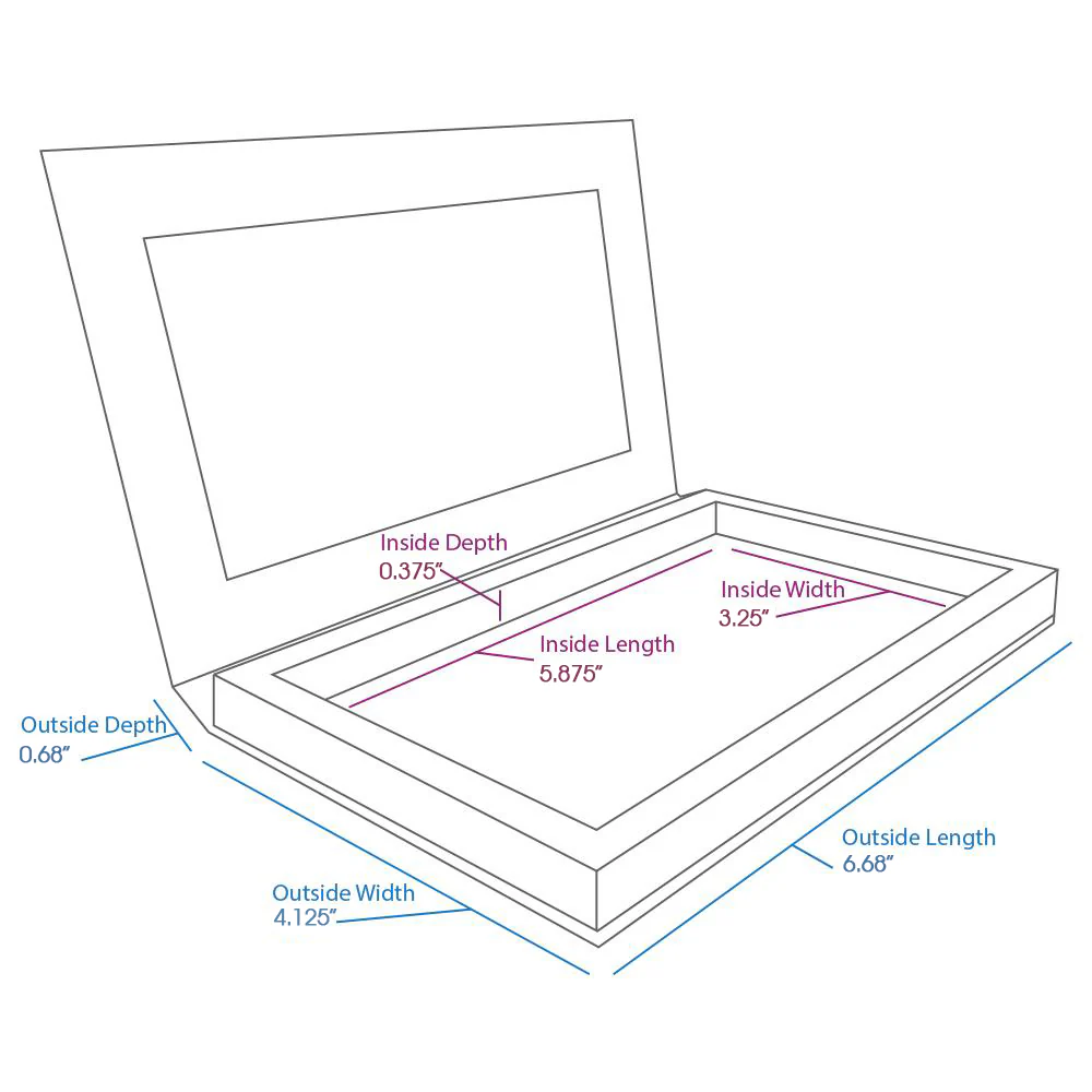 - Inside: 5.875″ L x 3.25″ W x 0.375″ D