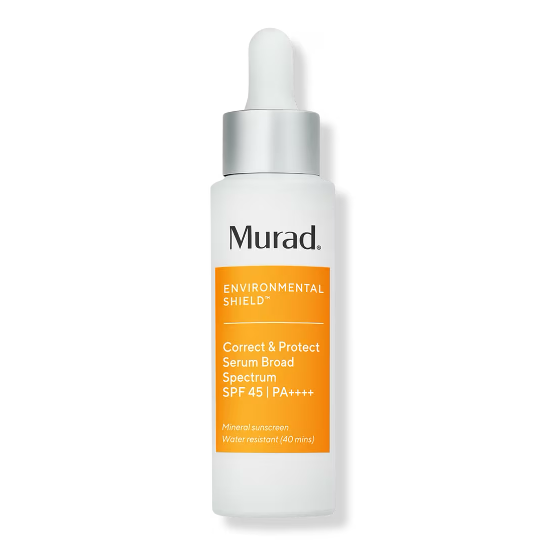 Murad Correct & Protect Broad Spectrum SPF 45| PA++++ is a satiny-smooth serum with 100% mineral SPF that’s clinically proven to visibly correct discoloration and prevent future hyperpigmentation.