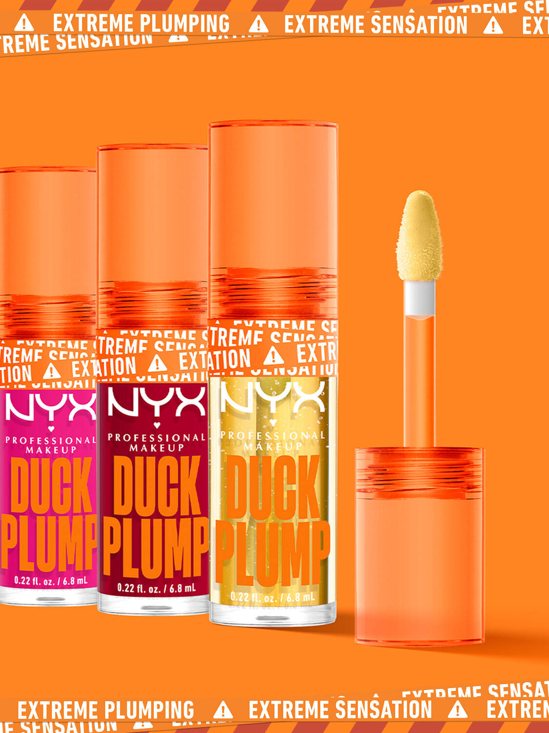 CAUTION! CAUTION! May cause duck lips! Get instant and overtime plumping for the ultimate ducking pout with NYX Professional Makeup’s Duck Plump Extreme Sensation Plumping Lip Gloss! Feel the extreme lip plumping gloss sensation powered by spicy ginger. Giving you 2 transparent shades and 16 high pigment shades to play from! Maximum intense color with minimum effort! Vegan formula. Pro performance.