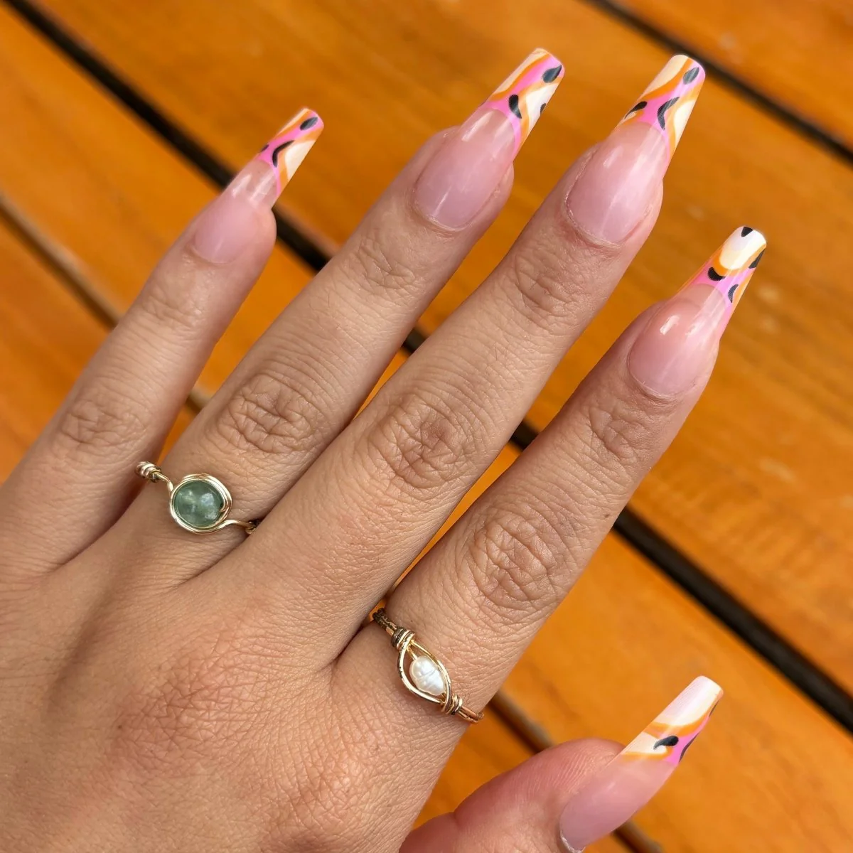 Exotic Babe Luxe press-on nails are coffin-shaped, extra long in length, with a clear nude acrylic base and orange, pink, and yellow french tip nail art. Our salon-quality nails can be applied within 5 minutes. All nail sets include our extra strength nail glue, which lasts up to 3 weeks.