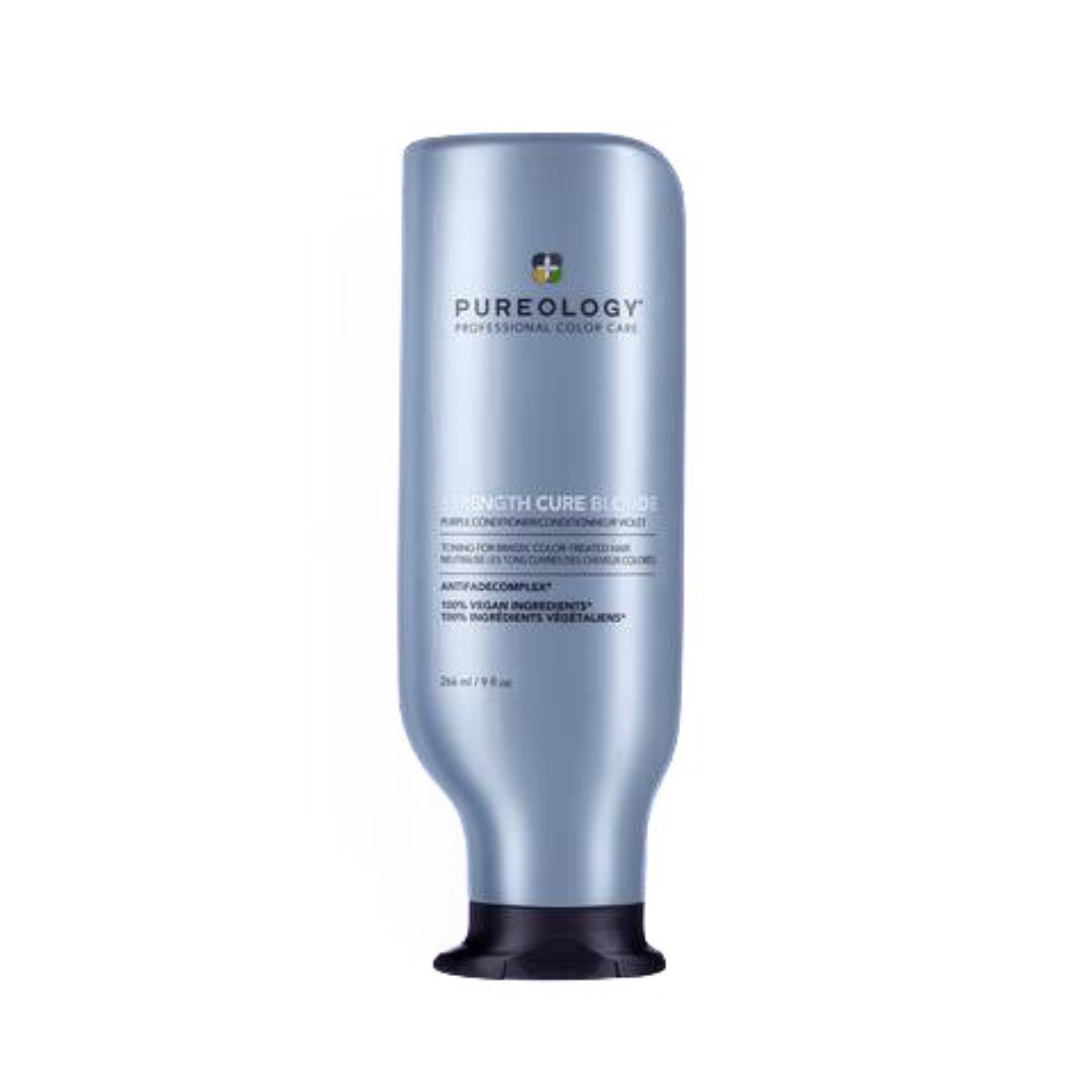 Pureology purple conditioner that tones down brassiness and strengthens damaged hair.