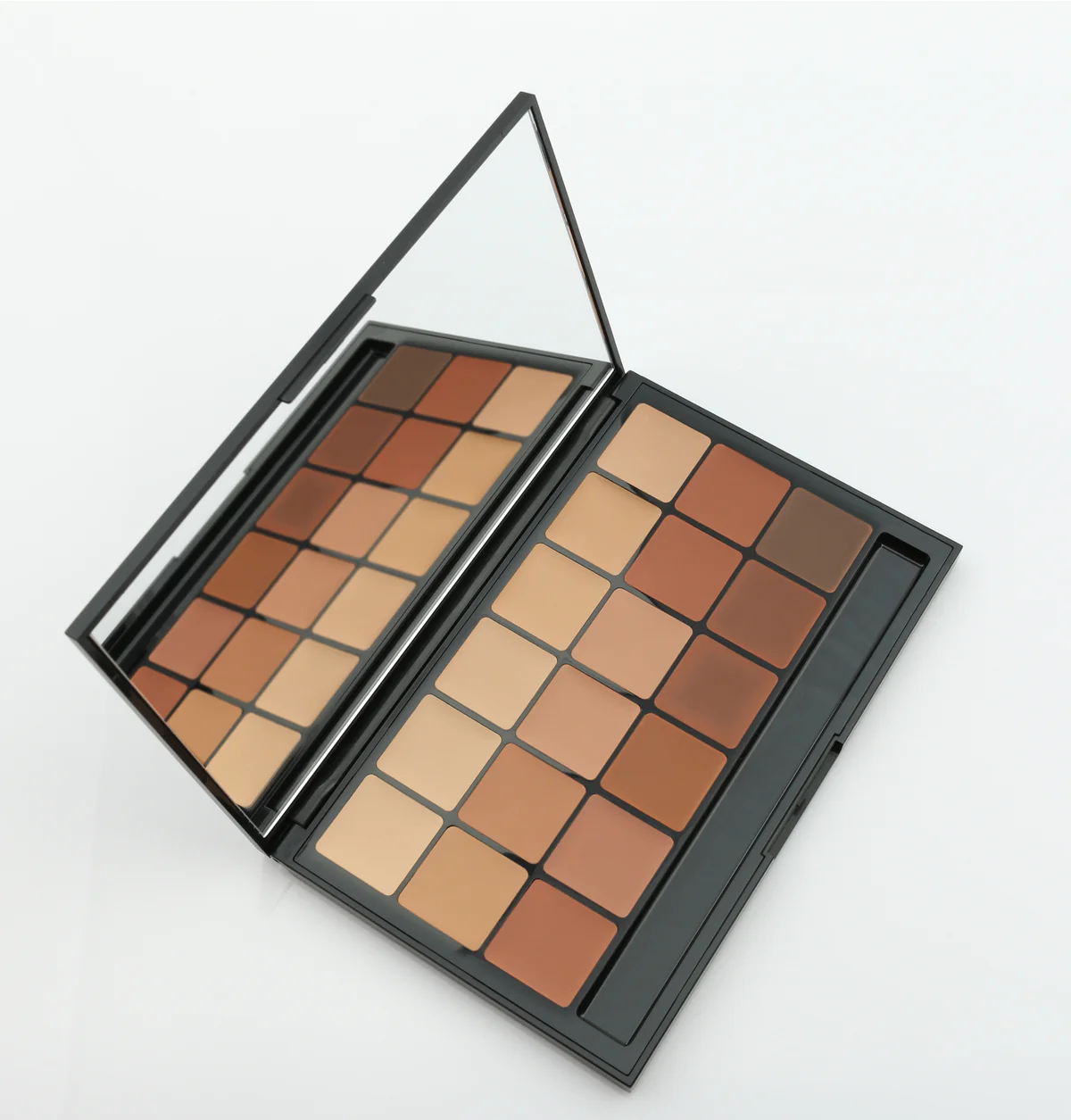 RCMA’S FOUNDATION/CONCEALER Palette is a staple for professional makeup artists across the world. Due to our high pigmentation, you can use RCMA as a foundation or concealer. Why buy two different products when you can buy one that does both jobs? Apply RCMA lightly to the skin for a flawless finish perfect for HD or everyday wear. With 18 colors to mix and match, you’ll find there are endless possibilities of different skin tones, all in one palette!Â