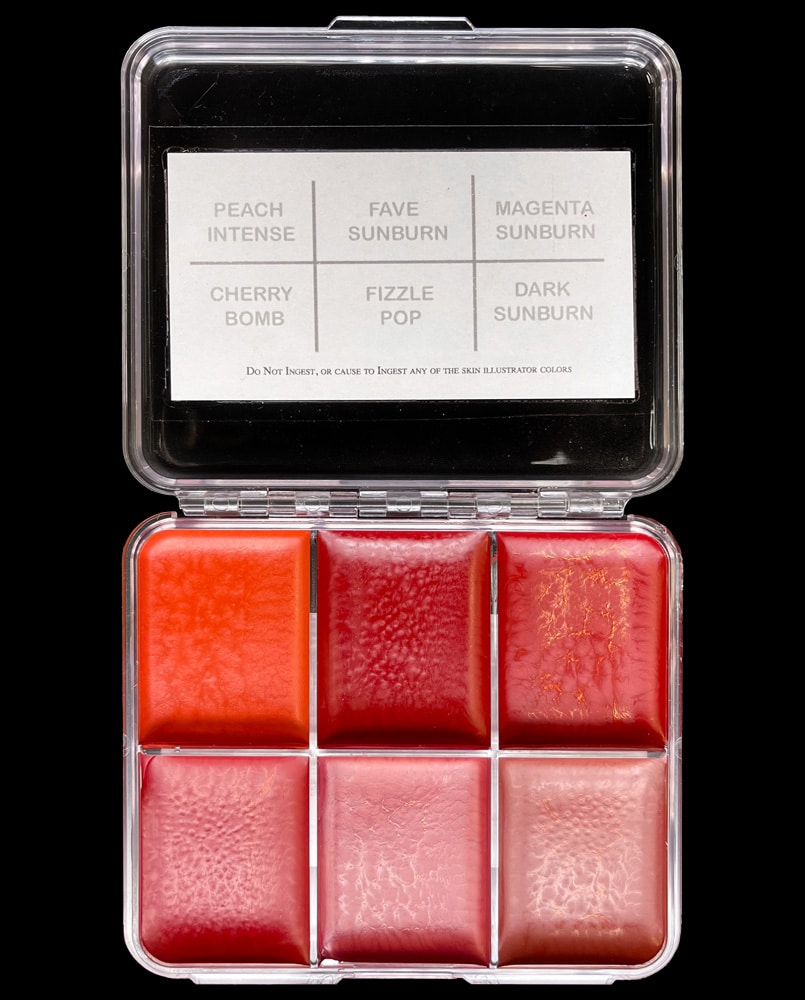 The Skin Illustrator Sunburn On Set Palette is a compact version of the Sunburn Palette, a collection of colors for creating multiple stages of realistic sunburn. Designed to work on a wide range of skin tones the colors include: