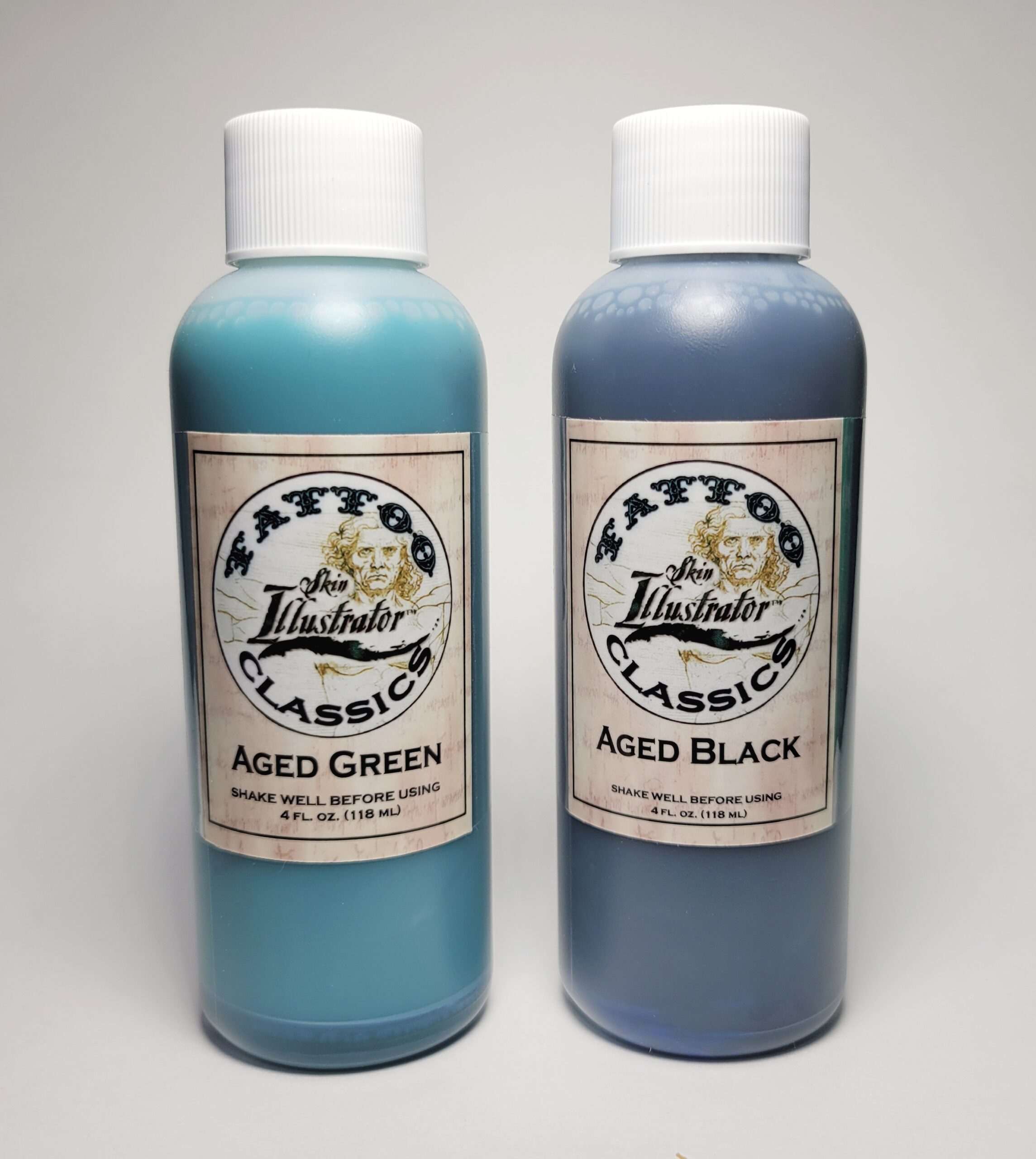 Skin Illustrator’s Tattoo Classic Palette Liquids can recreate any genre of tattoo using the classic aged black and green colors. From the old, faded, hand-made style to modern recreations of tribal bands to historical designs, Tattoo Classics can easily produce the aged effect you desire. The only variable is your application technique. Make it look modern, make it look classic, make it look like it’s been there forever! Also available in a dry palette.